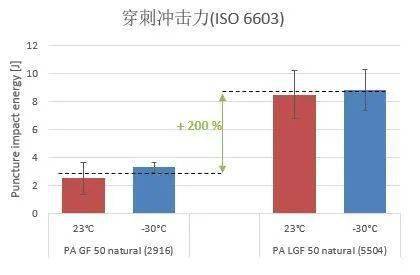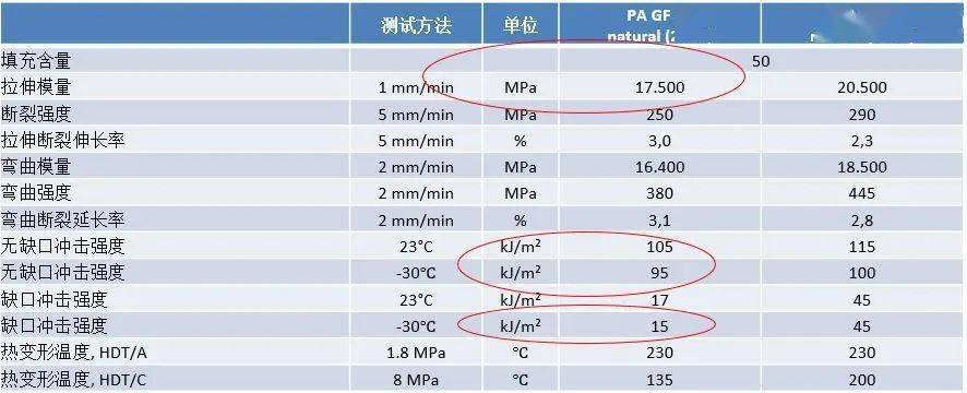 如上圖,PA GF 50 natural (2916)是一款基于PA66合金的50%短玻纖材料, PA LGF 50 natural (5504)是對應(yīng)的 50%長玻纖材料,從物性的對比上可以看到 剛性,強(qiáng)度,模量都有了一定的提升,尤其是缺口沖擊性能得到了質(zhì)的飛躍。