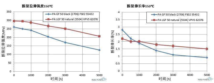 如上圖,在高溫150℃,5000個小時的熱老化后,長玻纖材料的拉伸強(qiáng)度從290Mpa下降到了 210Mpa,而短玻纖的拉伸強(qiáng)度從260Mpa下降到 了125Mpa,長玻纖的剛性保持率要優(yōu)于短玻纖,長玻纖抵抗熱老化的能力更強(qiáng)。
