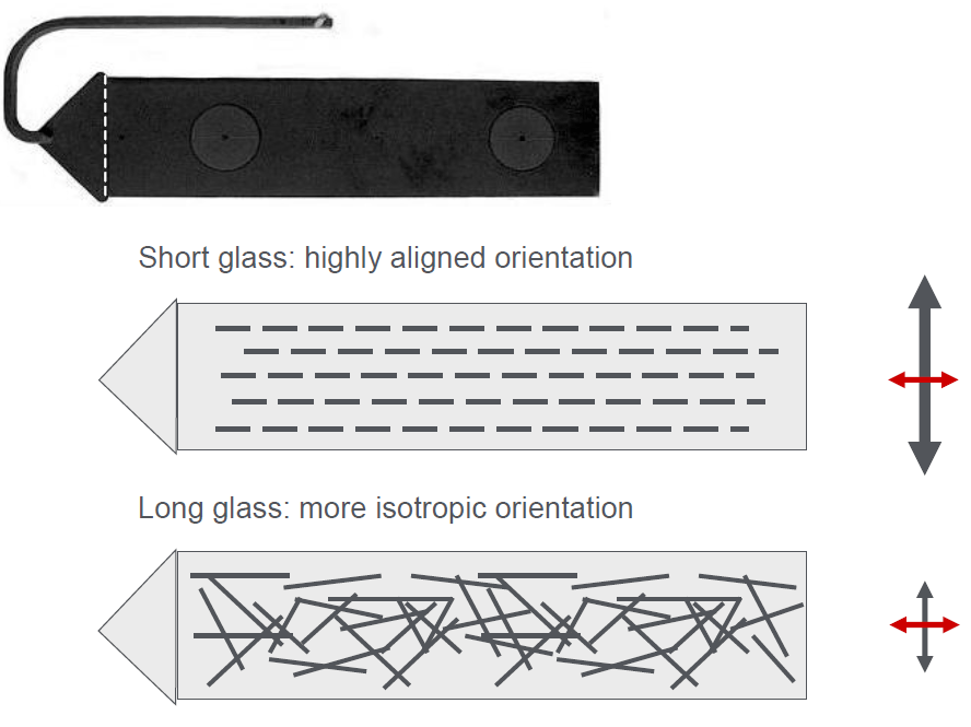 收縮率對零件的尺寸至關(guān)重要,短玻纖材料的橫向收縮率要遠(yuǎn)高于縱向收縮率,各向異性比較嚴(yán)重,導(dǎo)致零件的尺寸難以控制,收縮明顯。而長玻纖材料的橫向和縱向收縮率非常接近,顯示出各向同性,改善了零件翹曲的風(fēng)險,尺寸更易控制。