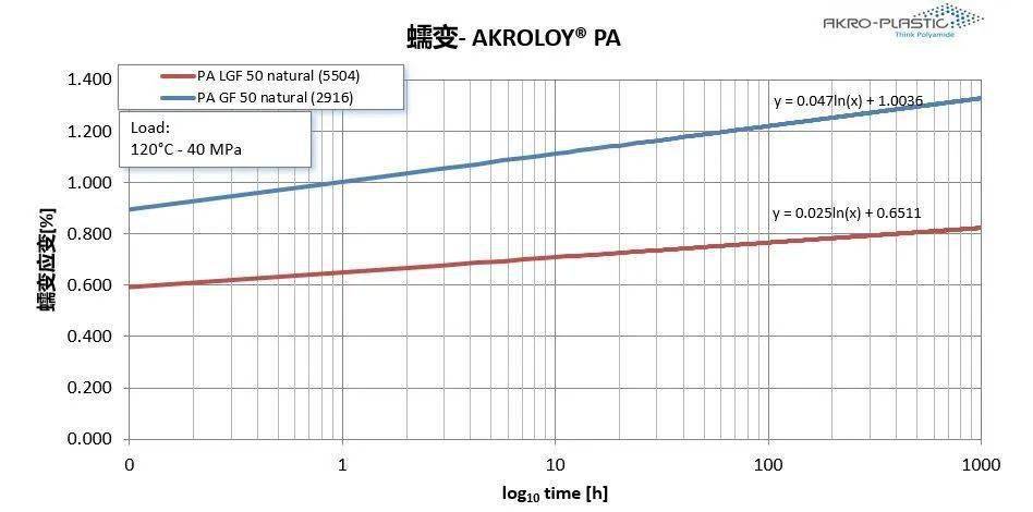 影響蠕變性能的因素有時間,溫度和載荷,在 120℃,40Mpa載荷下,長玻纖的蠕變明顯優(yōu)于短玻纖。這對于有長期靜態(tài)承壓的零件來說,至關(guān)重要,當(dāng)短玻纖無法滿足要求的時候,可以嘗試長玻纖。